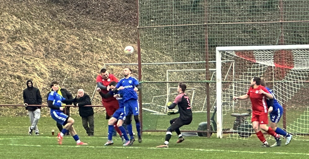 Do vedení šli domácí již ve 4. minutě zápasu po rohovém kopu, kdy si na Rosťu Mlčka plnou vahou naskočil a úspěšně hlavičkoval Vladimír Svejkovský. 1:0 (Tuto situaci se mi podařilo zachytit na fotce, která je nad článkem a ukazuje postavení bránících hráčů i našeho brankáře). Ve 24. minutě, opět po rohovém kopu, se dostal Martinem Bábíkem úspěšně vyražený míč na hranici šestnáctky k domácímu hráči, který jej obratem vrátil do malého vápna a v následující strkanici ho i s pomocí teče Martin Veverka dostal do naší branky 2 :0. Nevypadalo to s námi v této době moc dobře i proto, že domácí velmi dobře dostupovali a napadali naše hráče, kteří tak měli minimum času na zpracování míče či přesnou přihrávku. Naše hra dopředu byla tím pádem hodně kostrbatá a vypadalo to, že hrajeme spíše na náhodu než na cílenou nebo promyšlenou kombinaci. Martin Bábík měl neustále plné ruce práce a musel předvést poměrně dost zákroků k udržení tohoto stavu. A také velmi dobře hrající Ondra Zmeškal či Rosťa Mlček neměli v této fázi hry žádný čas na oddych. Přesto jsme dokázali ve 43. minutě snížit a vykřesat tak naději do druhé půlky.